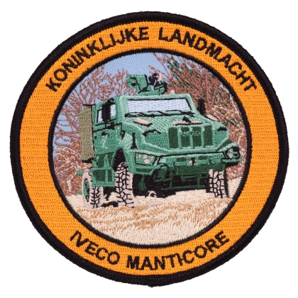 Koninklijke Landmacht Badge: Deze opstrijkbare badge toont het krachtige voertuig van de Koninklijke Landmacht, de Iveco Manticore – het nieuwste lichte operationele pantserwielvoertuig met een capaciteit van 12kN.