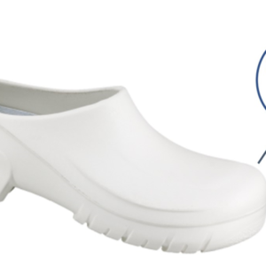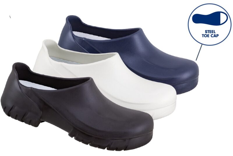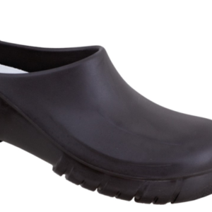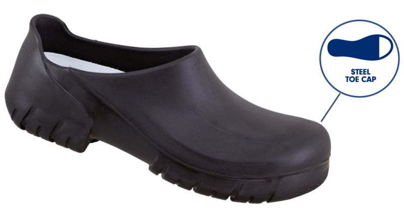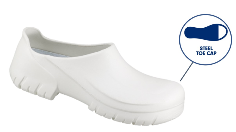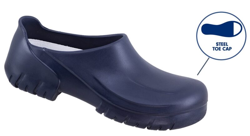 De BIRKENSTOCK ALPRO A640 is een PU klomp die voldoet aan strenge hygiënische normen en betrouwbare antislip eigenschappen biedt. Het gesloten ontwerp en de antislip profielzool bieden betrouwbare grip en maximale zekerheid in keukens en de voedingsindustrie. De solide stalen neus beschermt de tenen en de voorkant van de voet tegen schokken tot 200 joule. Het olie- en vetbestendige materiaal is ook waterafstotend en kan efficiënt en grondig worden gereinigd. Het kurk-latex voetbed kan worden verwijderd en de klomp kan bij maximaal 80° Celsius worden gewassen. Beide delen van de schoen zijn geschikt voor dagelijkse desinfectie.