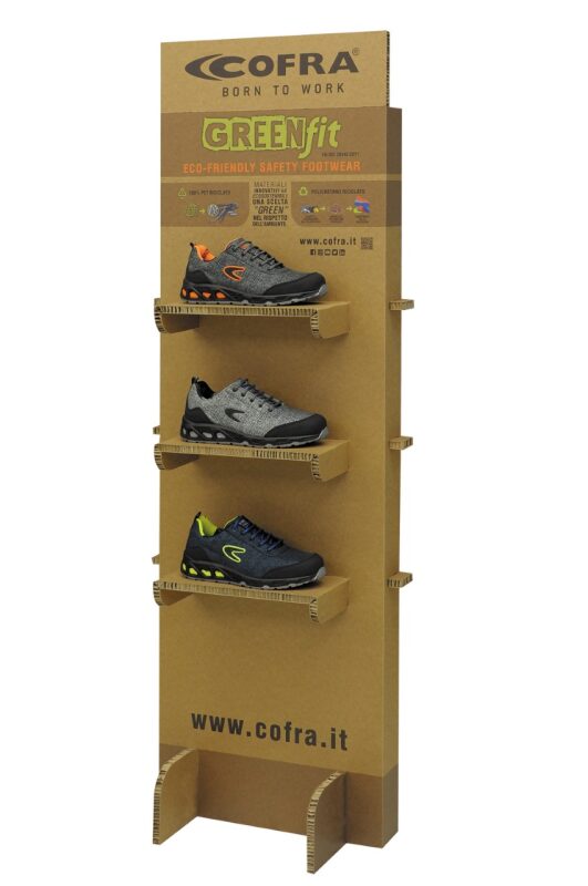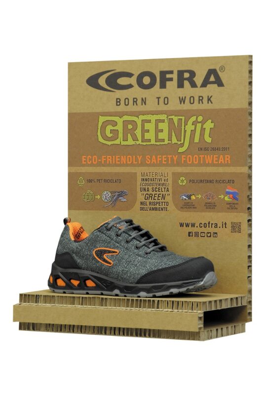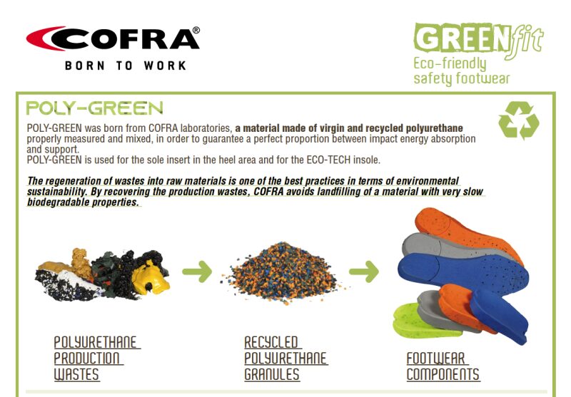 ESD De werkschoen is gemaakt van waterafstotend texpet (100% ecologische REPET). De loopzool van de Cofra schoen milieu bewust is van PU/TPU en Poly-Green voor de schokabsorptie. De werkschoen heeft een aluminium neus en metaalvrije APT Zool.