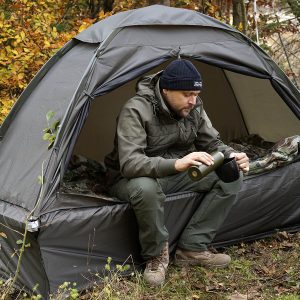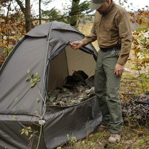 Een ander kenmerk van de tent zijn de verlengde flappen die tot aan de grond reiken, zodat je je bagage of andere items uit de wind of regen kunt houden door deze onder het veldbed te plaatsen.