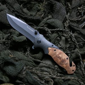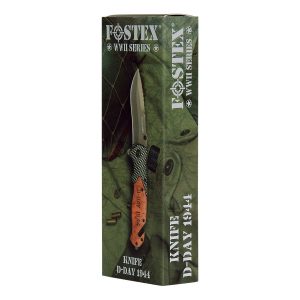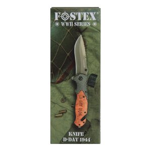 Kwalitatief zakmes met uniek militair design en in het hout gegraveerde D-Day 1944 tekst. Gaaf met carbon print & hout afgewerkt handvat.
