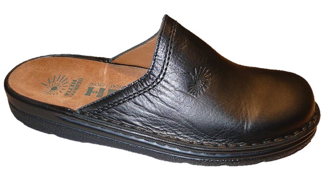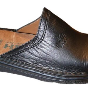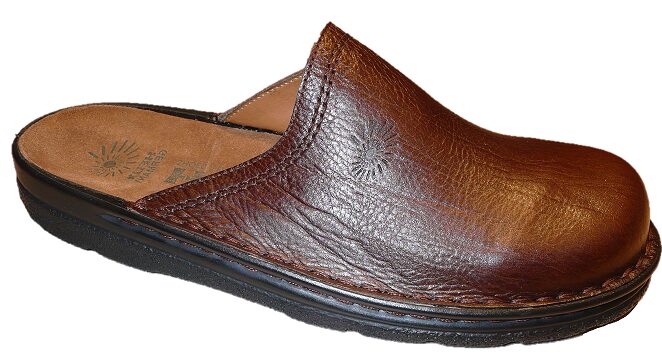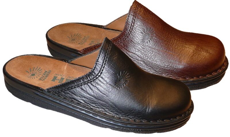 Leren Helix muil, geheel leder gevoerd met antislipzool en een goed voetbed voor heel goed loopcomfort. Lichtgewicht zool, kleur bruin en zwart. bredere leest