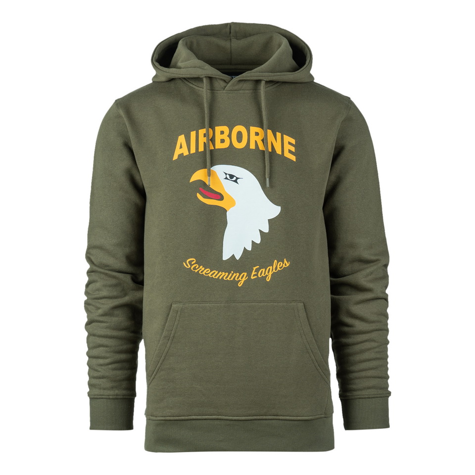 De hoodie is voorzien van een screaming eagle print. De screaming eagle is bekend van de 101st Airborne Divisie. Deze infanteriedivisie van het Amerikaanse leger is ingezet bij de Tweede Wereldoorlog, de Vietnam- oorlog en de oorlogen van Irak en Afghanistan