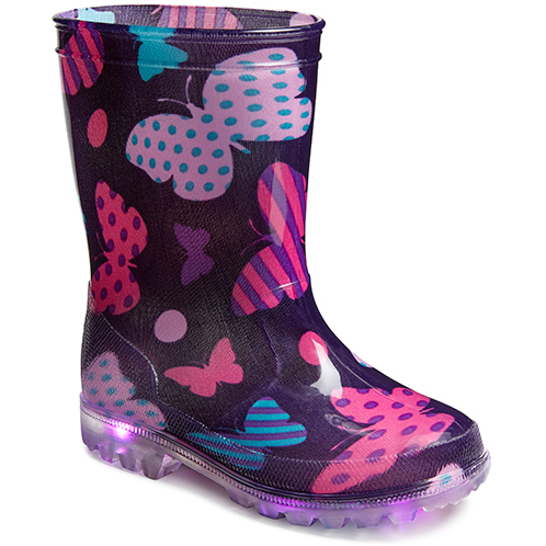 Deze 100% waterdichte, kinderlaars beschermt de voetjes onder alle omstandigheden. De laars is volledig samengesteld uit pvc en daardoor comfortabel, licht van gewicht en slijtvast. Bij iedere stap lichten de 100% veilige ledlampjes in de zool op. In combinatie met de transparante loopzool zorgt dit voor extra veiligheid in het donker en is het ook nog een feestje om deze laarsjes te dragen.