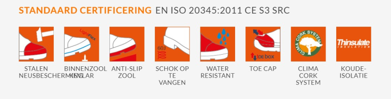 MATEN: 39 – 48 BREEDTE MAAT: 10 NORMERING: EN ISO 20345:2011 CE S3 SRC BESCHERMNEUS: STAAL BESCHERMZOOL: KEVLAR SCHACHT: VOLNERF LEER NUBUCK BINNENVOERING: SYMPATEX ZOOL: TWEE COMPONENTEN PU EXTRA: CLIMA CORK SYSTEM – Verhoogd draagcomfort door kurklaag GEWICHT: 667 gr per schoen (mt. 42) Type: Basic all-round veiligheidsschoen Geschikt voor: Logistiek, Automotive, Voeding, Bouw en Agri Bescherming: stalen neus en kevlar beschermzool Leest: standaard leest Zool: dunne zool – flexibel en licht gewicht Extra: lichtgewicht en flexibel, sportief model Inlegzool: standaard en Comfort Extra: Veterloos, Instapper Hoog