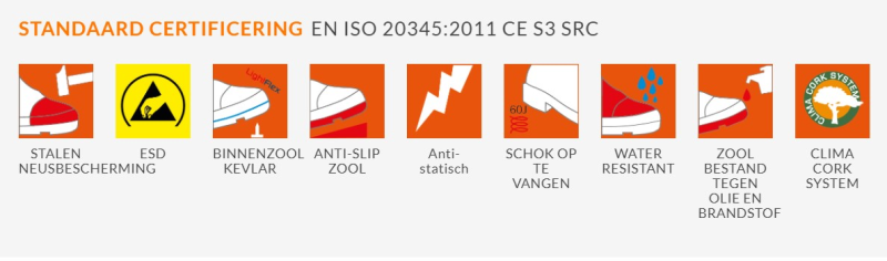 MATEN: 39 – 48 BREEDTE MAAT: 10 NORMERING: EN ISO 20345:2011 CE S3 SRC BESCHERMNEUS: STAAL BESCHERMZOOL: KEVLAR SCHACHT: REFLECTEREND TEXTIEL BINNENVOERING: COOLMAX ZOOL: TWEE COMPONENTEN PU EXTRA: CLIMA CORK SYSTEM – Verhoogd draagcomfort door kurklaag GEWICHT: 650 gram per schoen (mt 42) Type: Basic all-round veiligheidsschoen Geschikt voor: Logistiek, Automotive, Voeding, Bouw en Agri Bescherming: stalen neus en kevlar beschermzool Leest: standaard leest Zool: dunne zool – flexibel en licht gewicht Extra: Reflecterend textiel, lichtgewicht en flexibel, sportief model