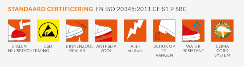MATEN: 39– 48 BREEDTE MAAT: 10 NORMERING: EN ISO 20345:2011 CE S3 SRC BESCHERMNEUS: STAAL BESCHERMZOOL: KEVLAR SCHACHT: VOLNERF LEER NUBUCK BINNENVOERING: TEXTIEL: CAMBRELLE ZOOL: PU/NITRIL EXTRA: CLIMA CORK SYSTEM – Verhoogd draagcomfort door kurklaag GEWICHT: 558 gr. per schoen (mt 42) Type: Basic all-round veiligheidsschoen Geschikt voor: Logistiek, Automotive, Voeding, Bouw en Agri Bescherming: stalen neus en kevlar beschermzool Leest: breedte 10, valt iets ruimer dan de Coltrane/Cole Zool: dunne zool voor flexibiliteit en hoge slipweerstand door Rubber Extra: ATOP - BOA Systeem, sportief model en dames leesten Inlegzool: Standaard en Comfort art. 1208.10 Winner collectie Snelsluiting: A-B41