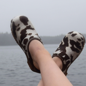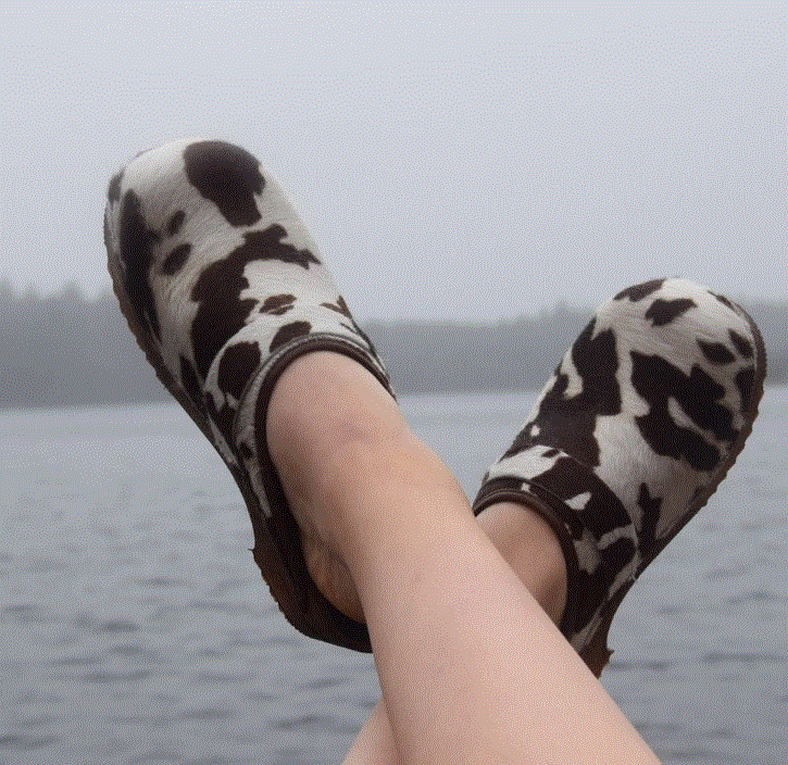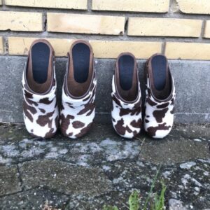 Sanita Caroline is gemaakt van bruin koeienbont, dat is geklemd op een bruin gebeitste houten zool van lindeboom.