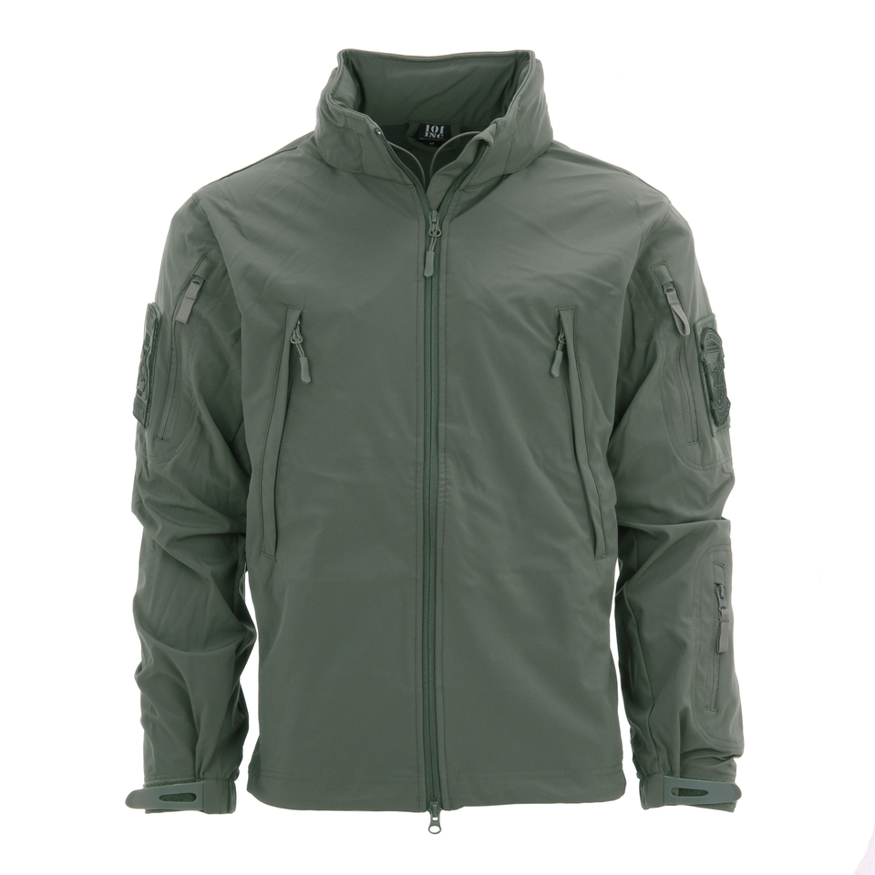 Softshell jack met oprolbare capuchon, hoge kraag, zakken met ritssluitingen en velcro patches.