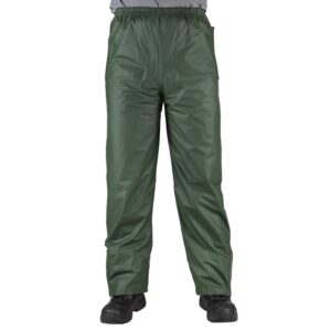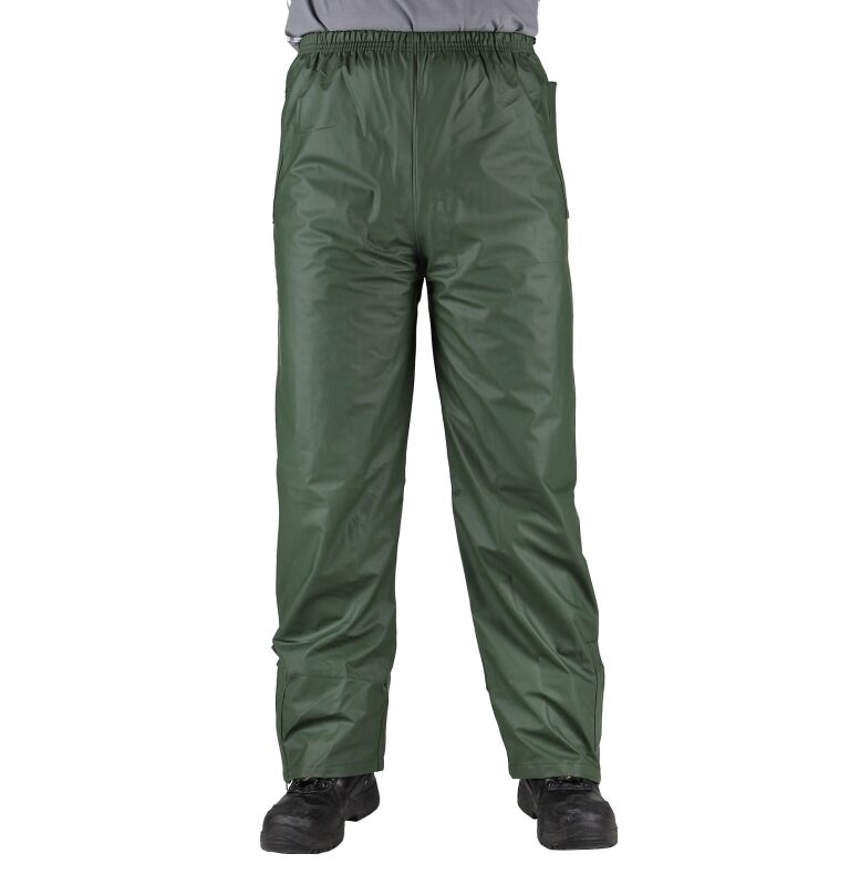 Stevige regenbroek welke zeer geschikt is om te dragen tijdens werkzaamheden met water. De groene regenbroek is 100% coated pu en heeft een EN343 normering welke aantoont dat de regenbroek van zeer hoge waterdichte kwaliteit is. De werk regenbroek heeft een elastische tailleband, is vuilaftstotend en heeft twee afsluitbare heupzakken.