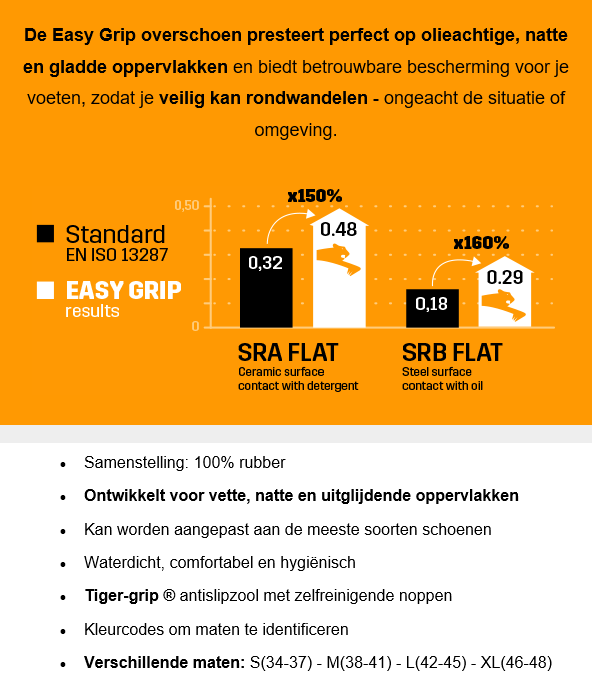 De Visitor Premium is licht en ergonomisch en biedt daardoor een uitstekend loopcomfort. Gebruikers profiteren van de hygiëne en het comfort van hun eigen schoenen, terwijl ze minder risico lopen dat ze uitglijden of verwondingen aan de voeten oplopen. De zeer lichte De Tiger Grip Visitor Premium veiligheids overschoen is lichtgewicht en biedt een uitstekend loopcomfort. De Visitor Premium overschoen is ideaal voor bezoekers op plekken waar veiligheidseisen van toepassing zijn; zoals in de industrie, bouw en logistiek. De bezoekers profiteren van de hygiëne en het comfort van hun eigen schoenen, terwijl de Tiger Grip overschoen ze beschermt tegen uitglijden of verwondingen aan de voeten. De Tiger Grip Visitor premium heeft naast een uitzonderlijke anti grip zool een zeer lichte veiligheidsneus van aluminium en titanium, welke bestand is tegen 200 Joule impact. De overschoen is gemakkelijk schoon te maken (wassen met een kleine hoeveelheid lauwwarm water en laten drogen) en is zeer slijtvast.
